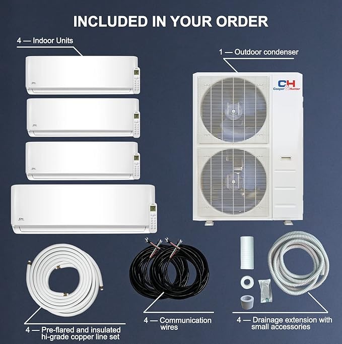 | Included Components | Indoor Wall Mount Units, Outdoor Condenser, Installation Kits, and Small Accessories. |